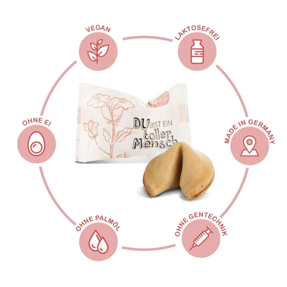 Die Kekse sind vegan, Made in Germany und frei von Palmöl, Ei, Laktose und Gentechnik. Jeder Glückskeks ist einzeln verpackt – hygienisch, frisch und perfekt zum Verschenken.