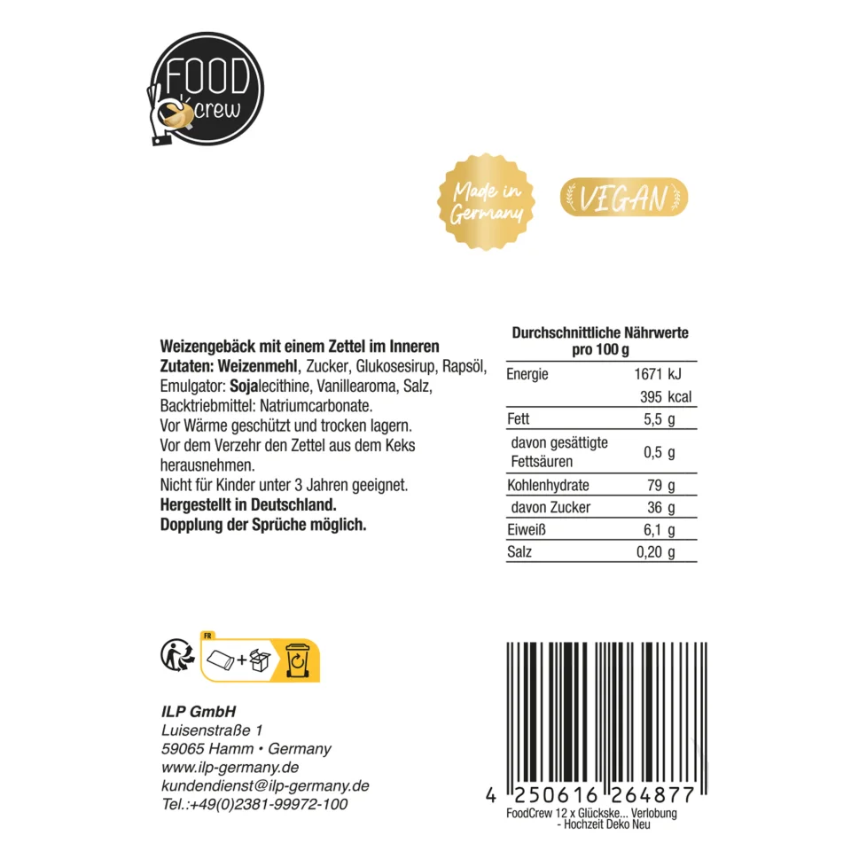 Die 12 Glückskekse kommen in einer eleganten Box und sind vollständig vegan, handverpackt und in Deutschland hergestellt. Das macht sie zur nachhaltigen, hochwertigen Alternative zu herkömmlichen Giveaways – mit Stil und Herz.