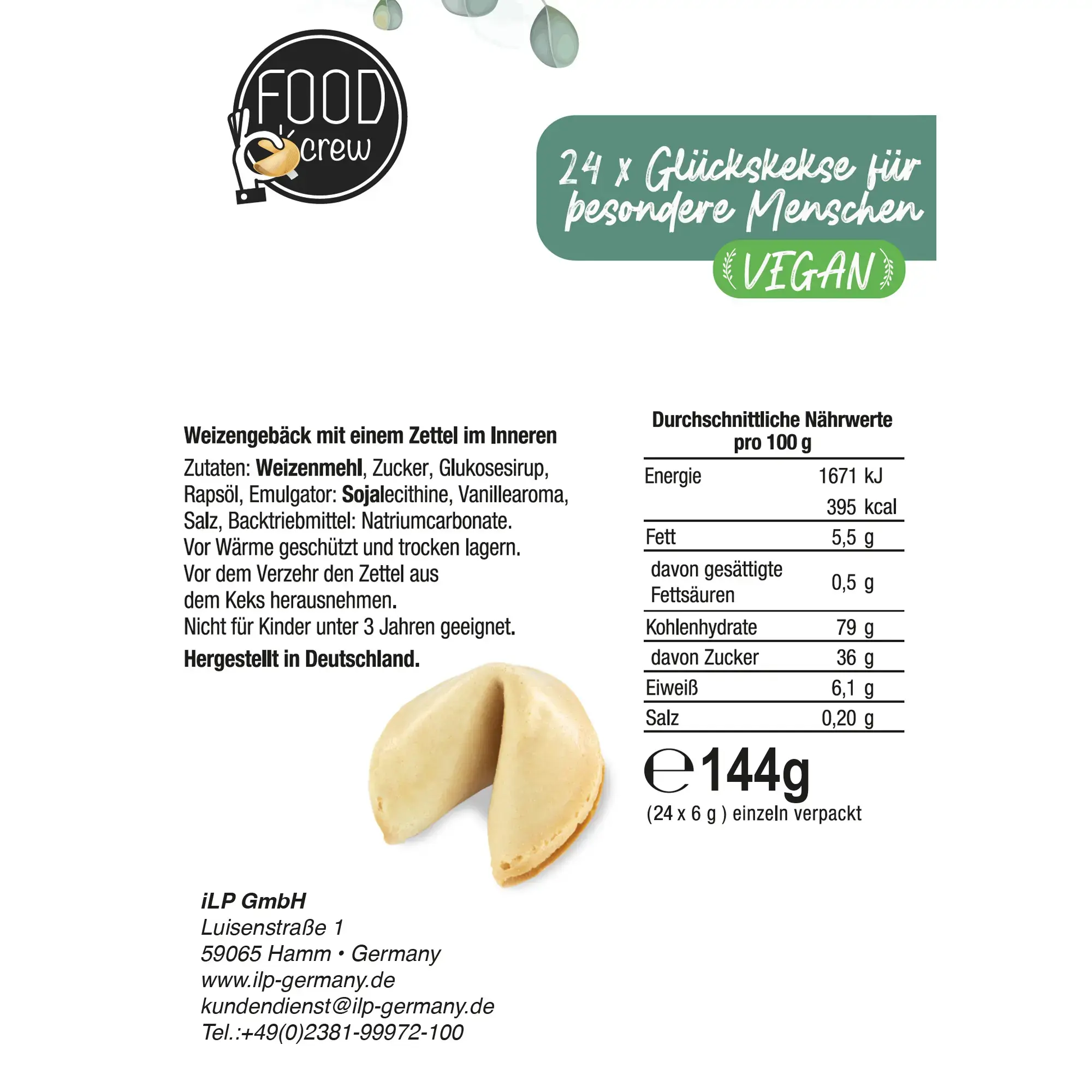 Die Glückskekse werden in Deutschland produziert – aus rein pflanzlichen Zutaten. Damit sind sie nicht nur geschmackvoll und knusprig, sondern auch zuverlässig in Qualität und Herkunft.