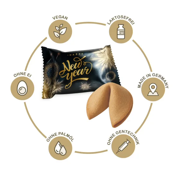 Die Silvester-Glückskekse werden in Deutschland aus rein pflanzlichen Zutaten produziert. Das sorgt für einen gleichmäßig knusprigen Biss, ein feines Aroma und kurze, vertrauenswürdige Lieferwege. Ideal für bewusste Genießer, Unternehmen und Gastgeber, die Wert auf Qualität und Herkunft legen.