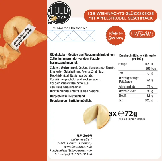 - Vor dem Verzehr den Zettel aus dem Keks herausnehmen.