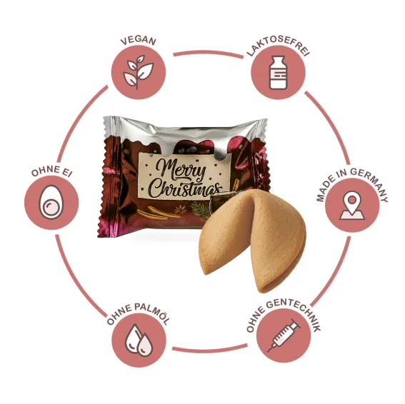 Jeder Glückskeks ist einzeln in einer festlich gestalteten Folie verpackt und bleibt dadurch lange frisch und hygienisch. Im Inneren wartet ein Spruch – mal besinnlich, mal humorvoll – passend zur Weihnachtszeit. Damit sind die Kekse nicht nur ein süßer Snack, sondern auch ein stimmungsvolles Detail für jede Feier.