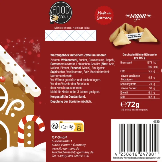 Die Glückskekse werden in Deutschland gebacken und verpackt. Sie sind vegan, laktosefrei und kommen ohne Palmöl, Ei und Gentechnik aus – für bewussten Genuss mit festlichem Geschmack.