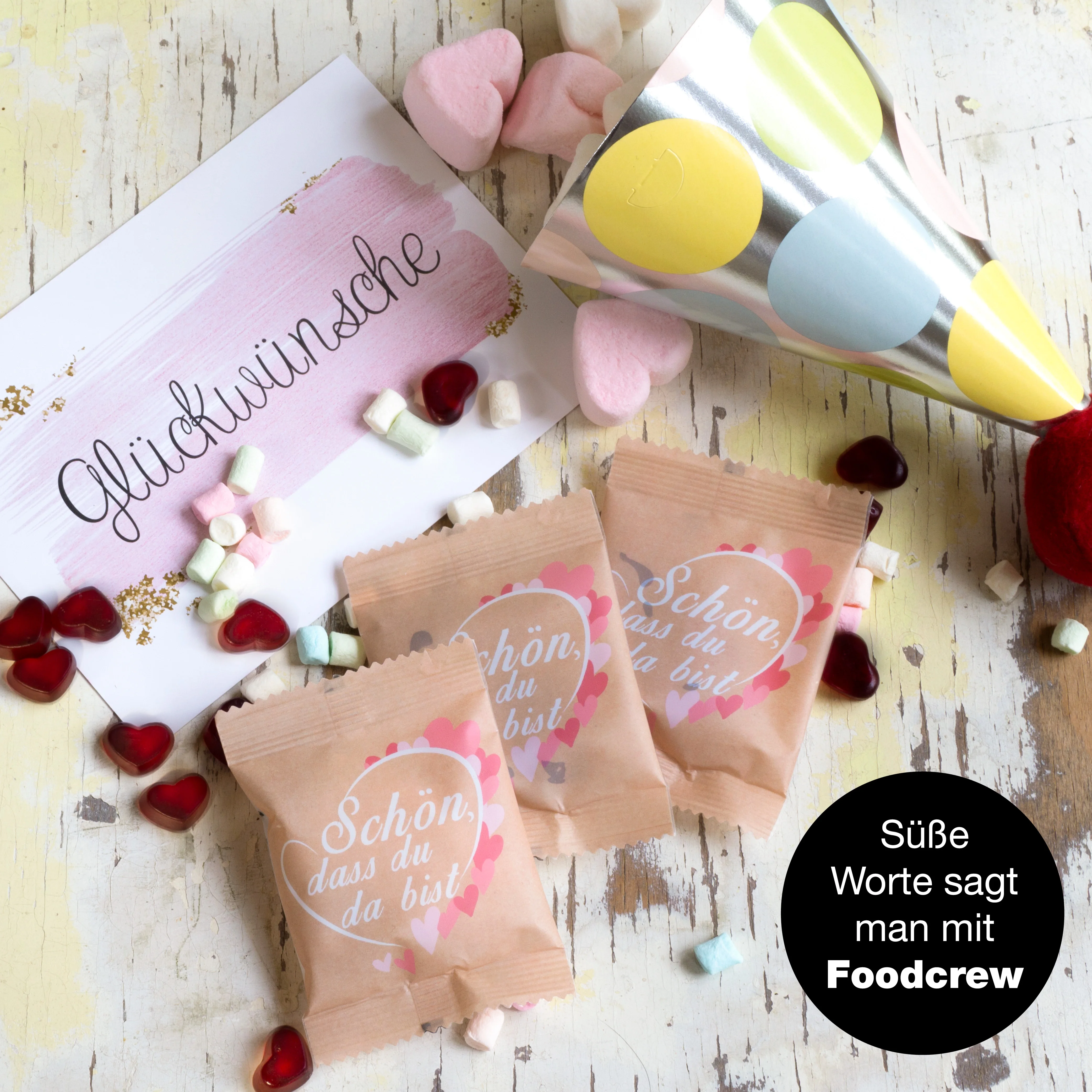 Ob auf dem gedeckten Tisch, als Füllung für Gastgeschenk-Boxen, zum Verteilen auf Hochzeiten, Taufen, Geburtstagen oder Kommunionen – die Kraftpapier-Verpackung sorgt für einen warmen, persönlichen Eindruck. Gleichzeitig sind die Fruchtgummi Herzen handlich portioniert und lassen sich problemlos an deine Gäste verteilen.