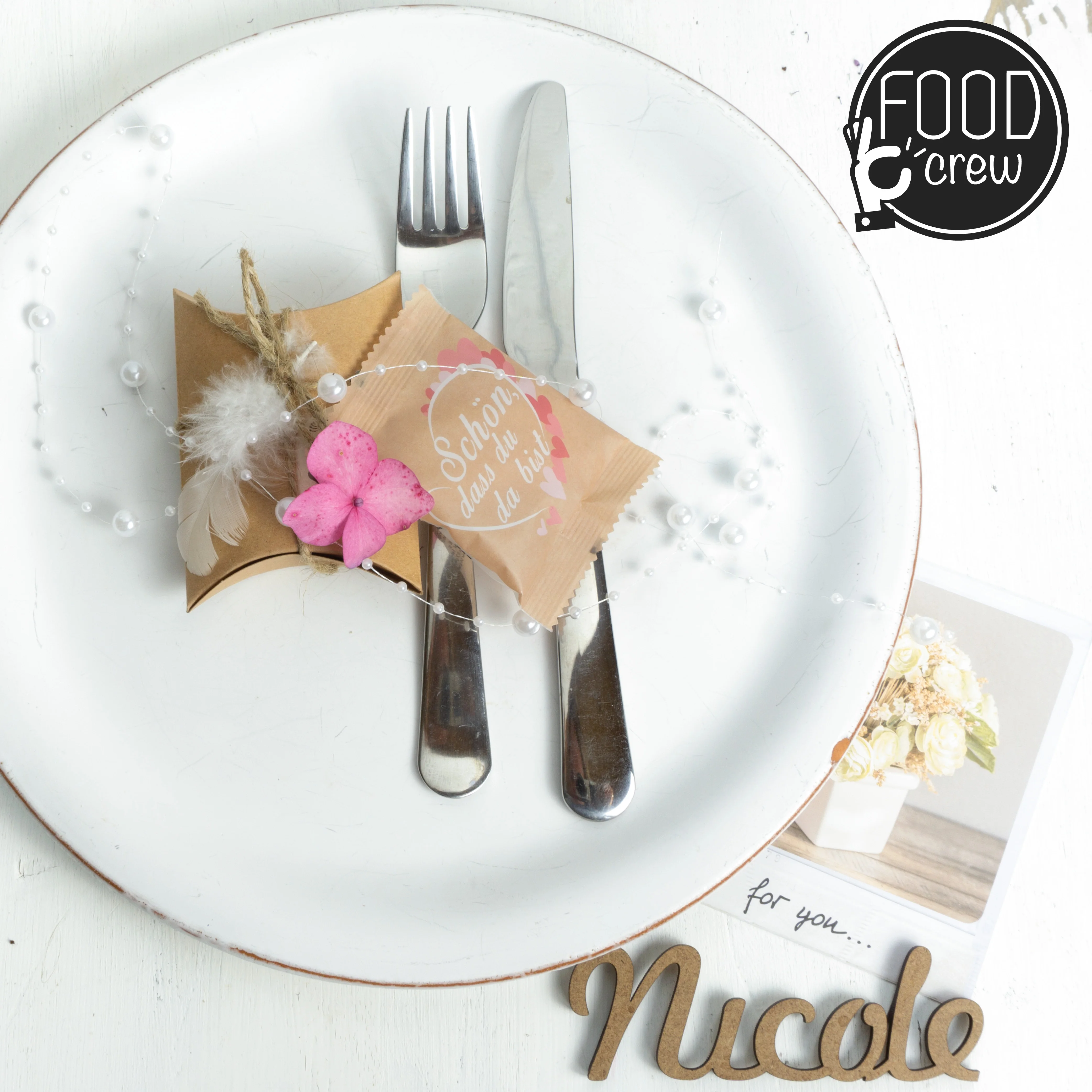 Die Fruchtgummi Herzen im Kraftpapier-Design sind eine charmante und nachhaltige Variante des beliebten Klassikers „Schön, dass du da bist“. In den kleinen, naturfarbenen Tütchen steckt nicht nur ein fruchtiger Himbeer-Geschmack, sondern auch eine herzliche Botschaft, die jedem Gast ein Lächeln ins Gesicht zaubert.