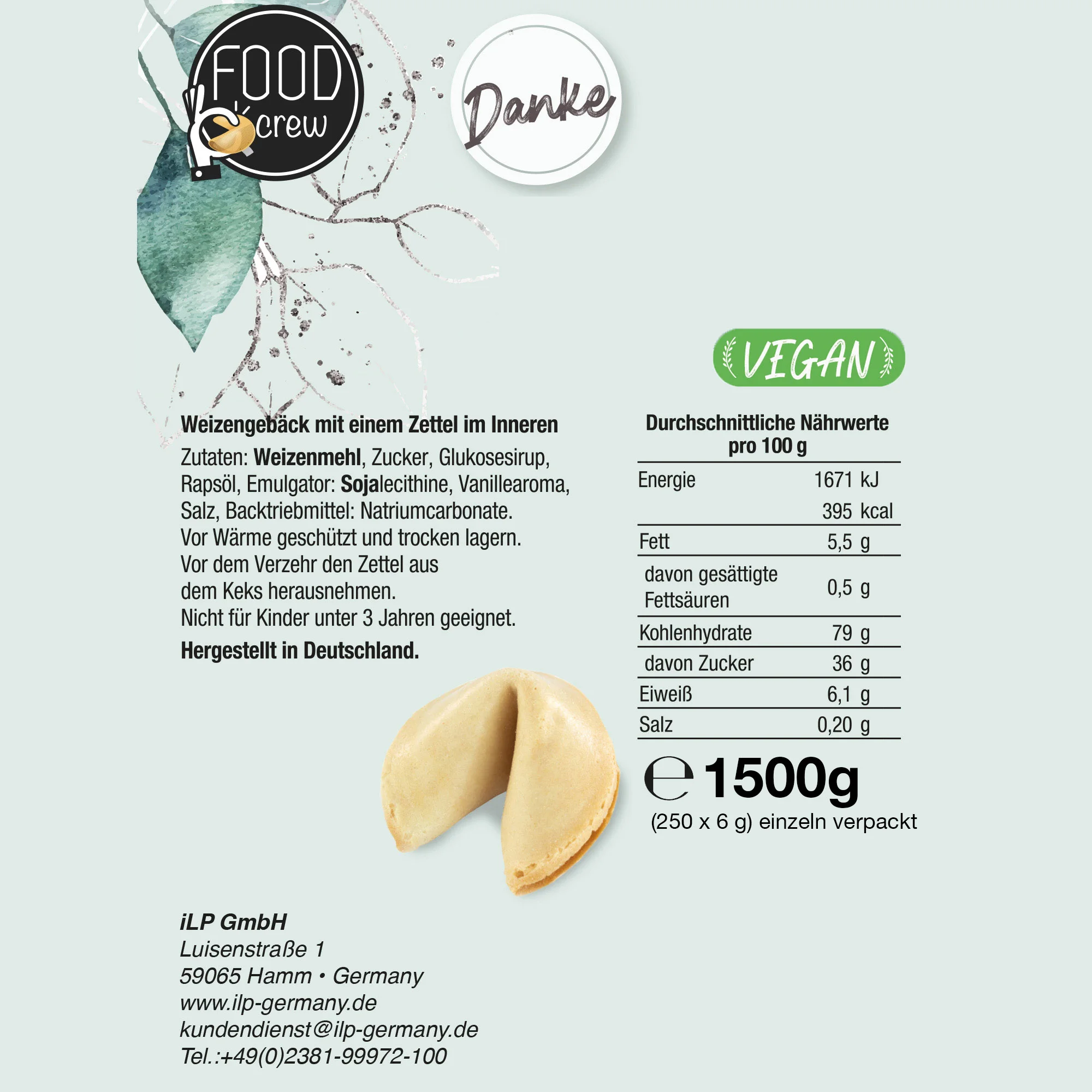 Dank der 250 Stück bist du perfekt vorbereitet für große Runden. Die Verpackungen sind mit drei verschiedenen „Danke“-Motiven versehen – in Deutsch, Englisch und Französisch – und damit universell einsetzbar. Ob im Business, auf einer privaten Feier oder als Giveaway auf Veranstaltungen: Diese Glückskekse kommen immer gut an.