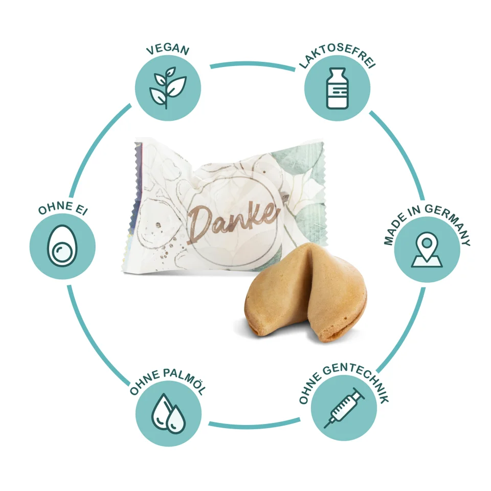 Jeder Keks wiegt ca. 6 g, ist vegan, frei von Palmöl und mit einem liebevollen Spruchzettel gefüllt. Die hochwertige Box sorgt dafür, dass du die Glückskekse praktisch lagern und flexibel einsetzen kannst. Produziert in Deutschland, steht diese Großpackung für Qualität und Originalität.