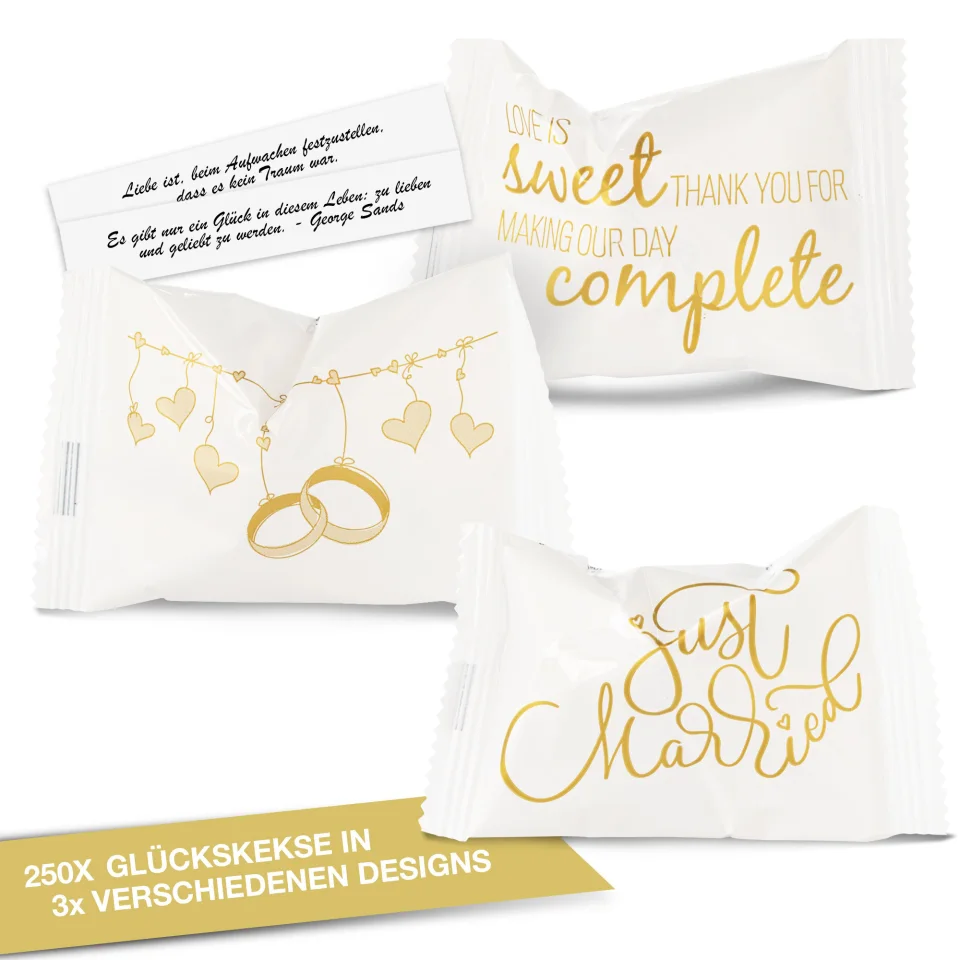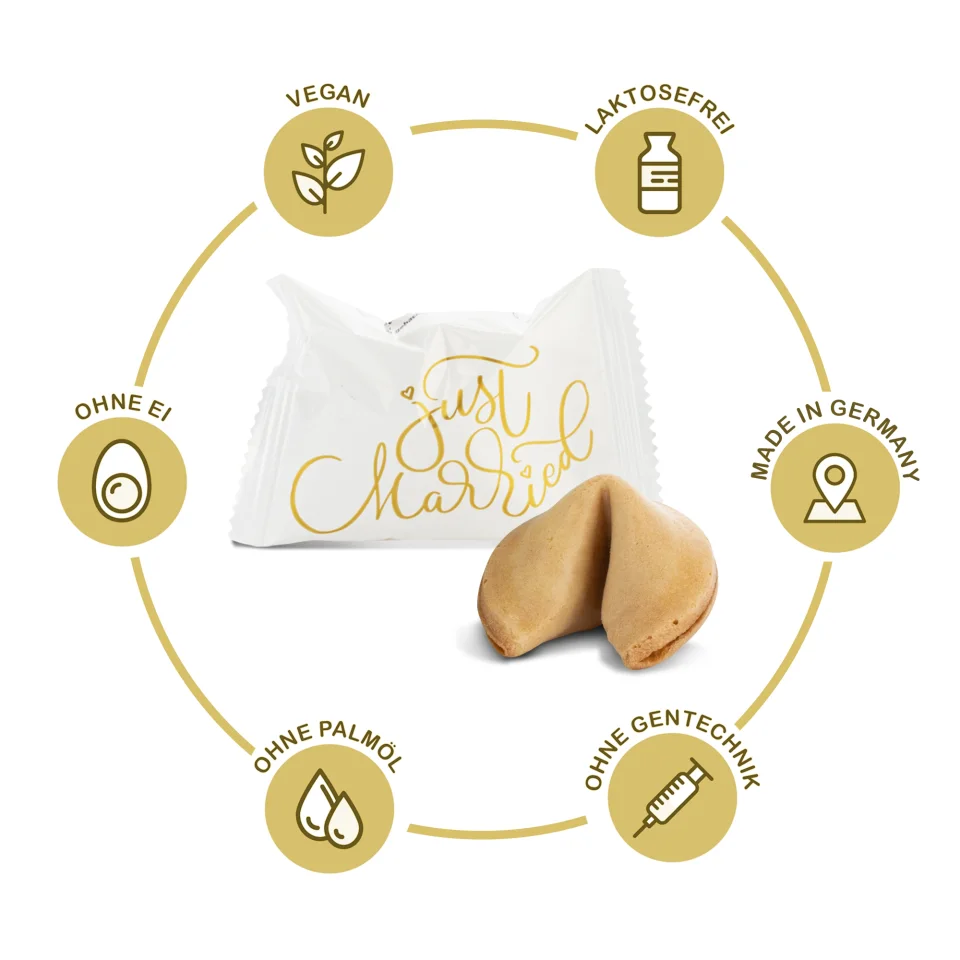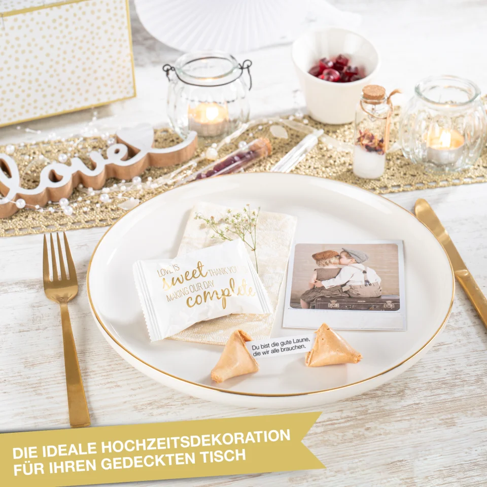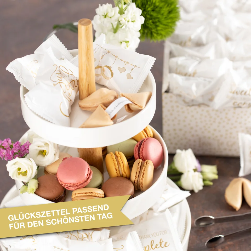 Ob als dekorative Überraschung auf der Hochzeitstafel, als Dankeschön an die Gäste oder als kleines Präsent im Geschenkkorb – diese Glückskekse sind vielseitig einsetzbar und ein süßes Detail, das deine Feier unvergesslich macht.