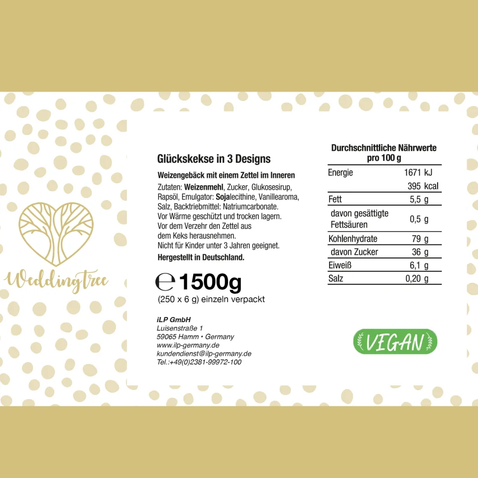 Die Glückskekse Hochzeit sind die perfekte Idee, um deinen Gästen auf der Feier ein Lächeln ins Gesicht zu zaubern. Mit 250 einzeln verpackten Keksen bist du bestens ausgestattet für Hochzeiten, Verlobungsfeiern oder als originelles Geschenk für das Hochzeitspaar. Jeder Keks enthält eine kleine Weisheit oder Glücksbotschaft rund um das Thema Liebe & Ehe.