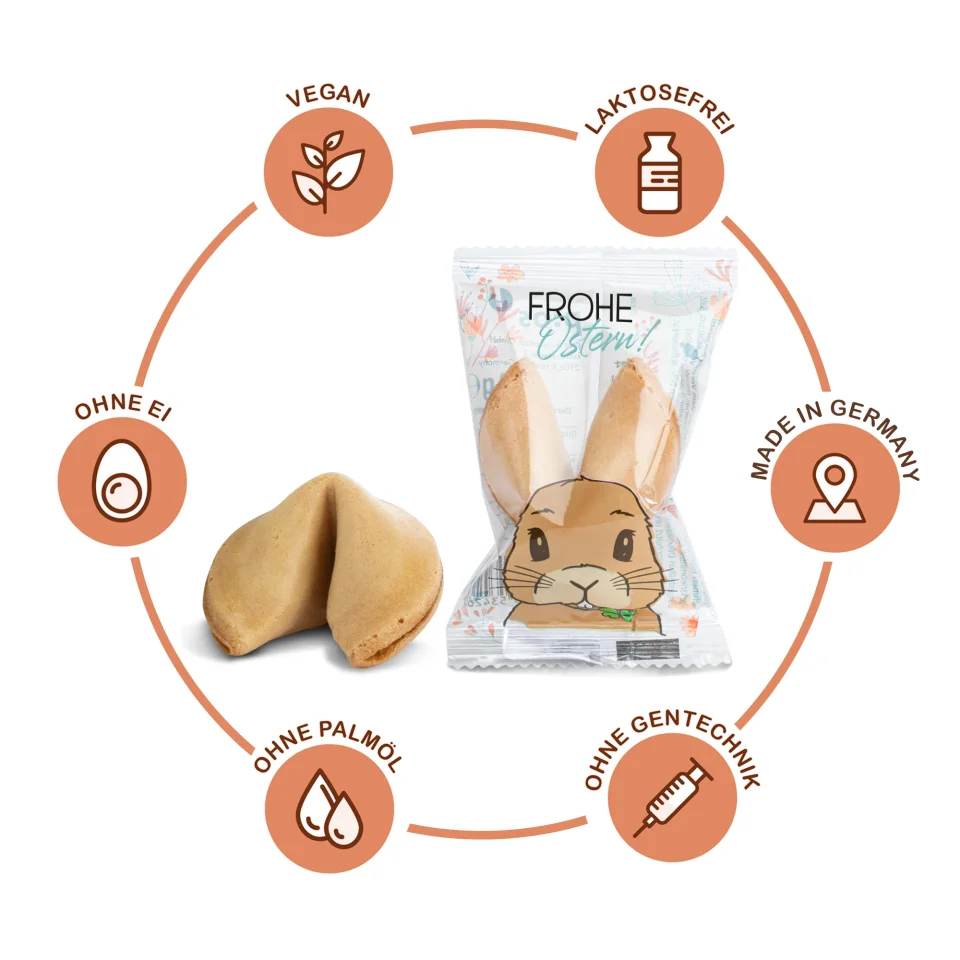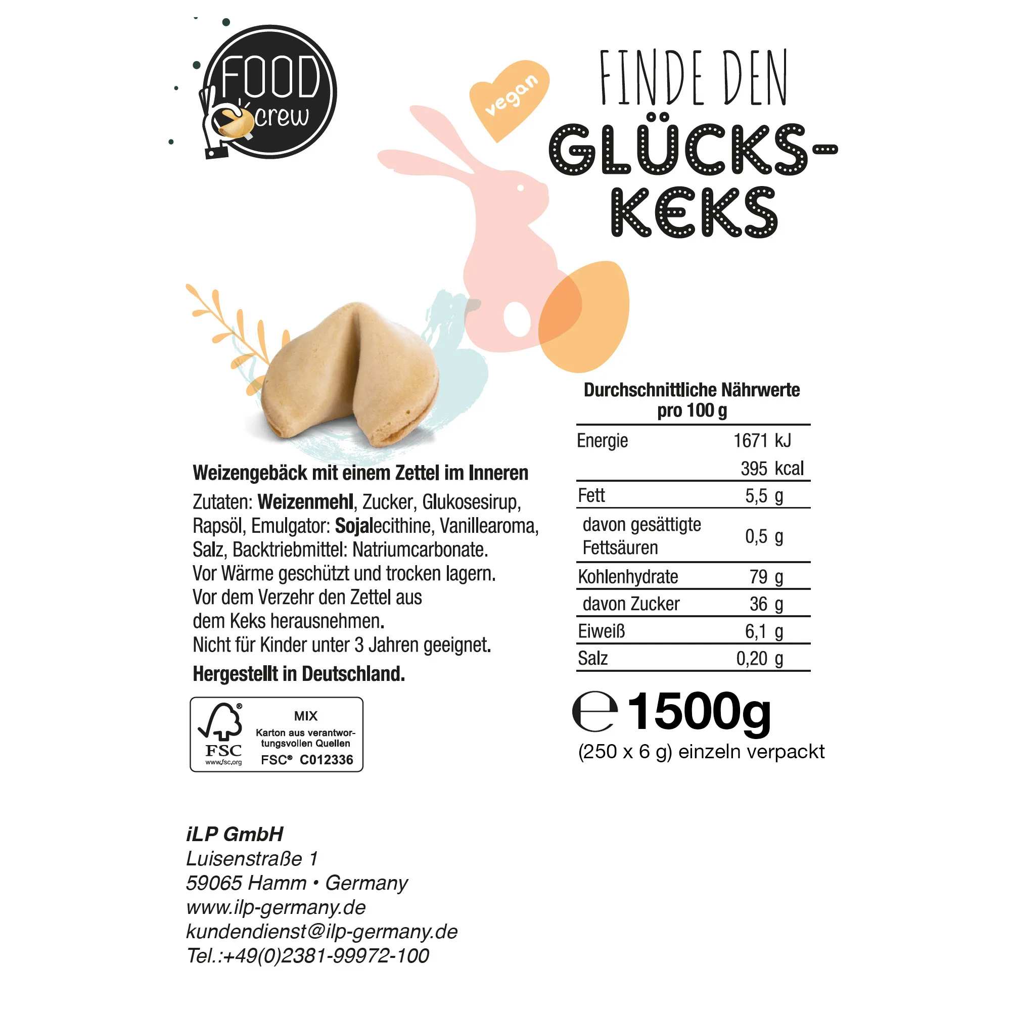 Mit den FOOD crew Glückskeksen Ostern sorgst du für gute Laune bei jeder Feier. Die große 250er Box ist perfekt geeignet für Osterpartys, Familienfeste, Firmenaktionen oder als originelle Geschenkidee für das Osterfest. Jeder Glückskeks ist einzeln verpackt im fröhlichen Osterdesign und enthält kleine Botschaften, die deine Gäste überraschen und zum Schmunzeln bringen.