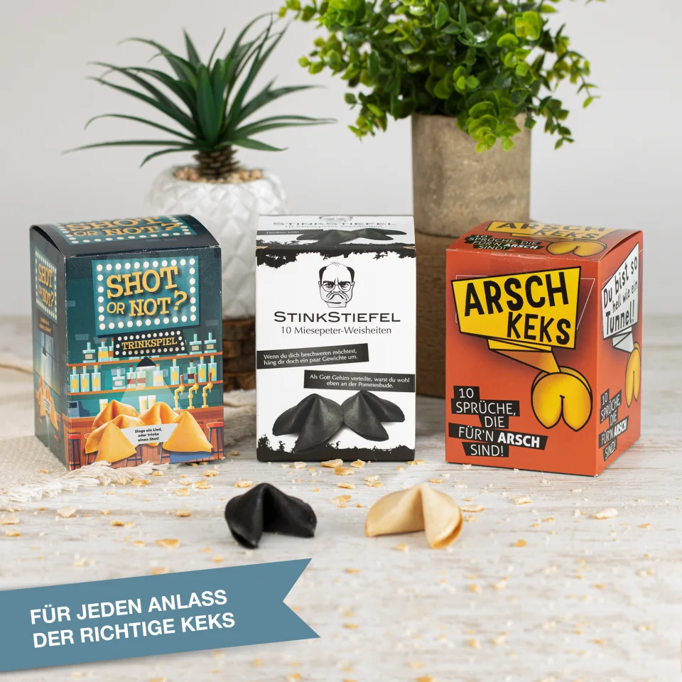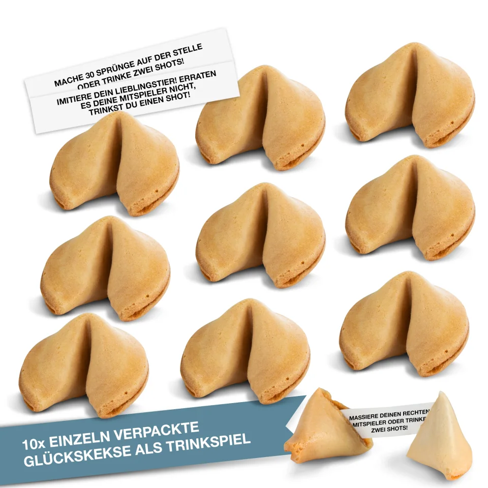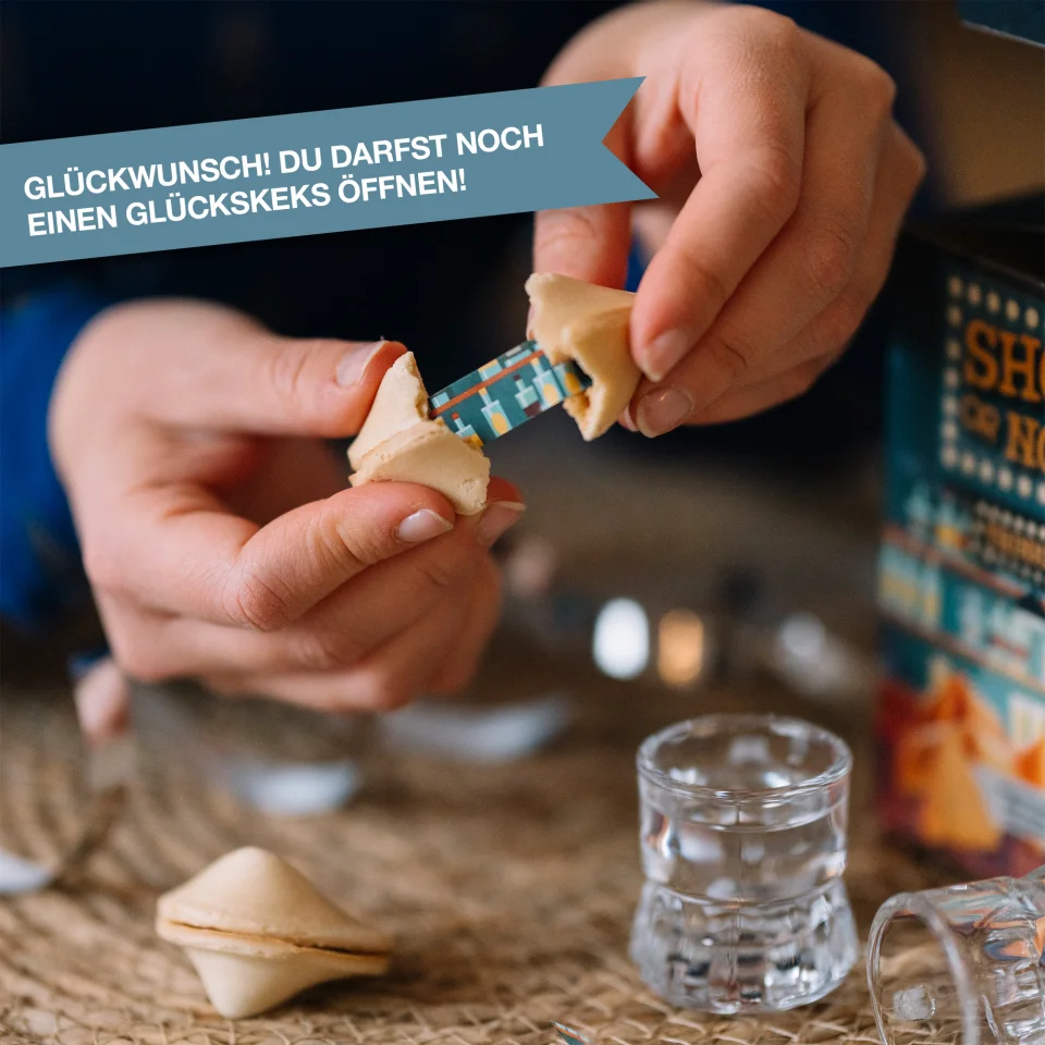 Ob „Singe ein Lied oder trinke einen Shot“ oder „Dein rechter Nachbar muss sein Glas austrinken“ – die Aufgaben sind abwechslungsreich, frech und sorgen garantiert für unvergessliche Momente. Mit 10 Glückskeksen pro Box hast du genau die richtige Menge, um jede Runde aufzulockern.
