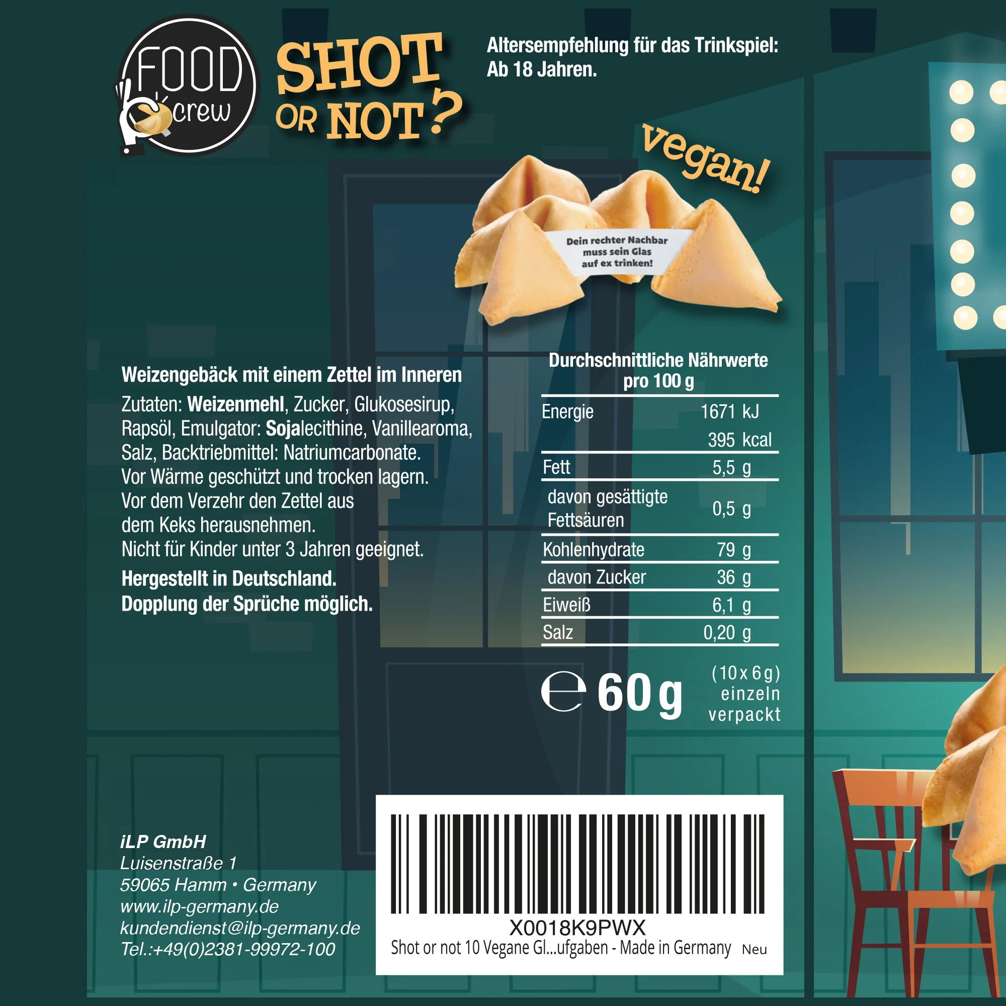 Mit den FOOD crew Glückskeksen „Shot or Not“ bringst du jede Party auf das nächste Level. Statt klassischer Sprüche enthalten diese Kekse witzige Trinkspiel-Aufgaben, die für Stimmung und jede Menge Lacher sorgen. Jeder der 10 Kekse ist einzeln verpackt und sofort einsatzbereit – perfekt für Geburtstage, WG-Partys, Junggesellenabschiede oder einfach den nächsten Spieleabend mit Freunden.