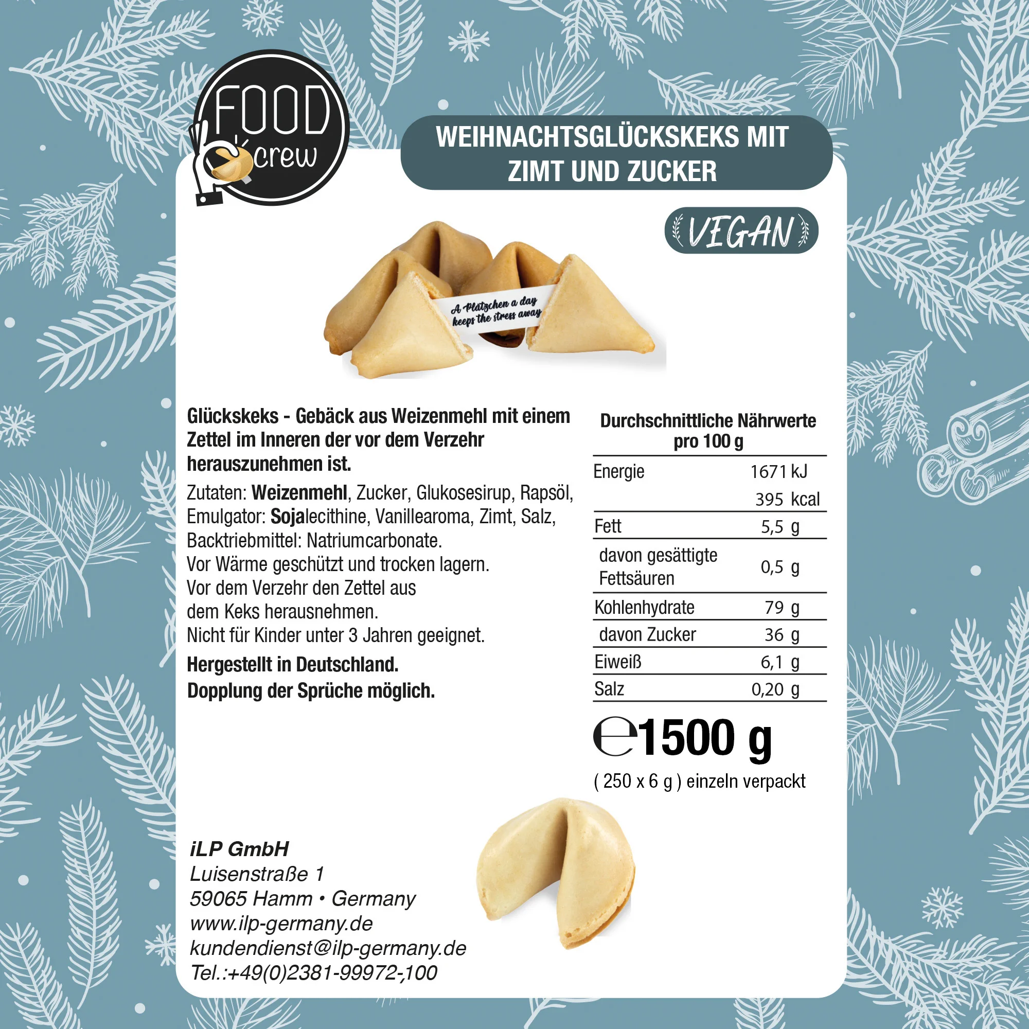 Mit den FOOD crew Weihnachtsglückskeksen sorgst du für festliche Stimmung und überraschende Momente in der Weihnachtszeit. Die 250er Großpackung ist perfekt geeignet für Familienfeiern, Firmenweihnachtsfeiern, Adventsaktionen oder als süßes Highlight in Adventskalendern. Jeder Glückskeks ist einzeln verpackt im weihnachtlichen Design und enthält deutsche Sprüche rund um Weihnachten und Glück.