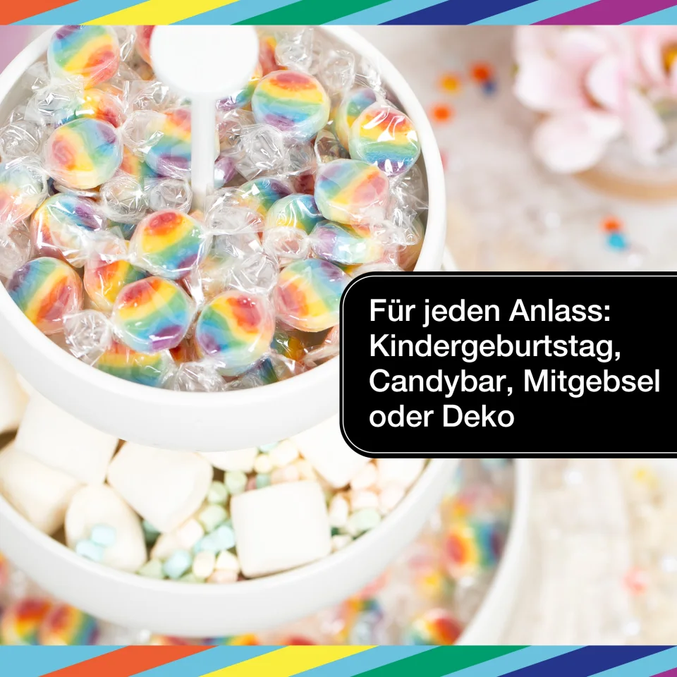 Ob als süßes Geschenk, für Kindergeburtstage, Hochzeiten oder als bunte Candybar-Dekoration: Die Regenbogen Rocks Bonbons sorgen für gute Laune und bringen Farbe in jeden Anlass.