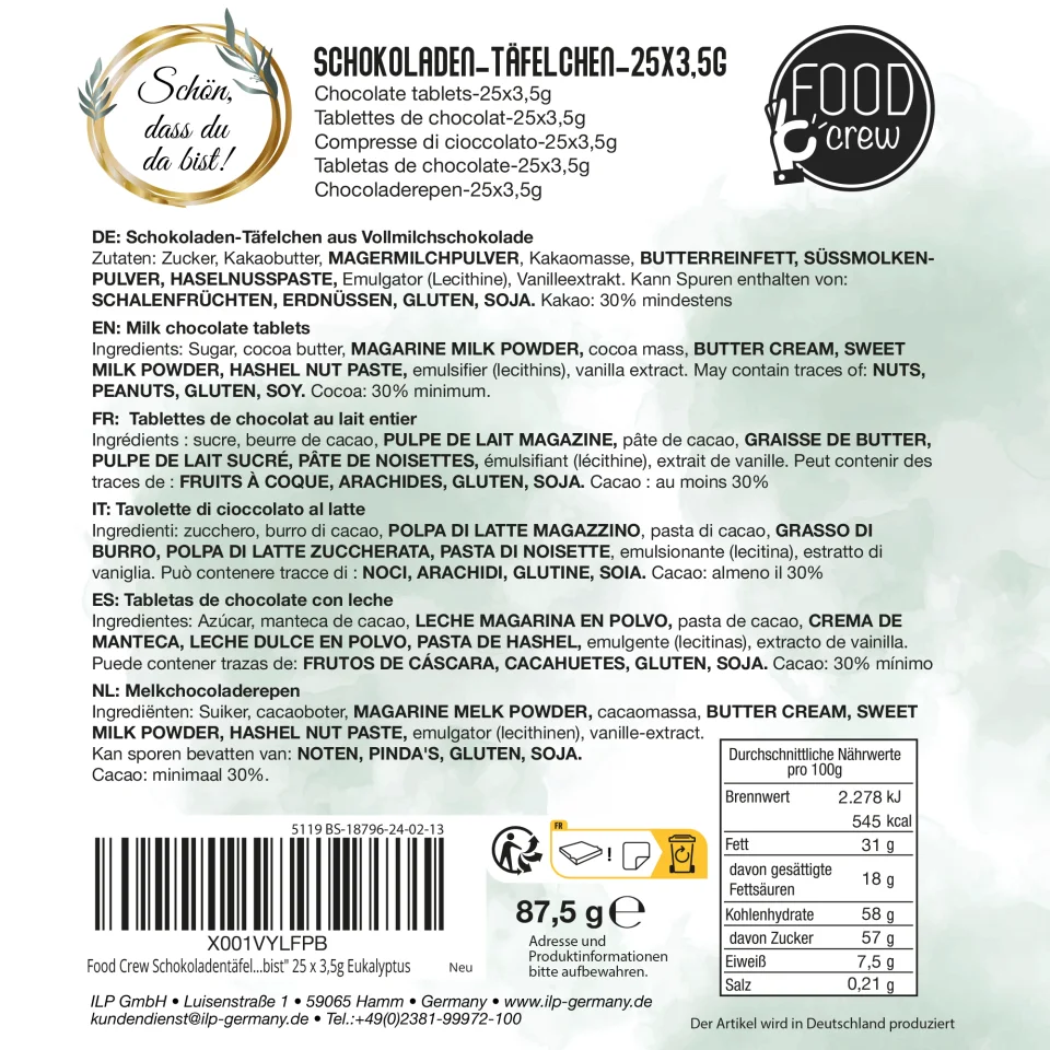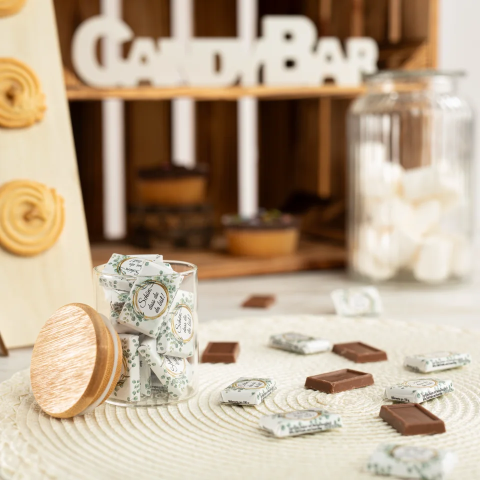 Die Schokolade überzeugt mit einem Kakaoanteil von mindestens 30 % und einem cremig-milden Geschmack. Hergestellt in Deutschland, stehen die Täfelchen für geprüfte Qualität. Jede Mini-Schokolade ist einzeln verpackt, bleibt frisch und hygienisch und eignet sich somit ideal zum Weitergeben.