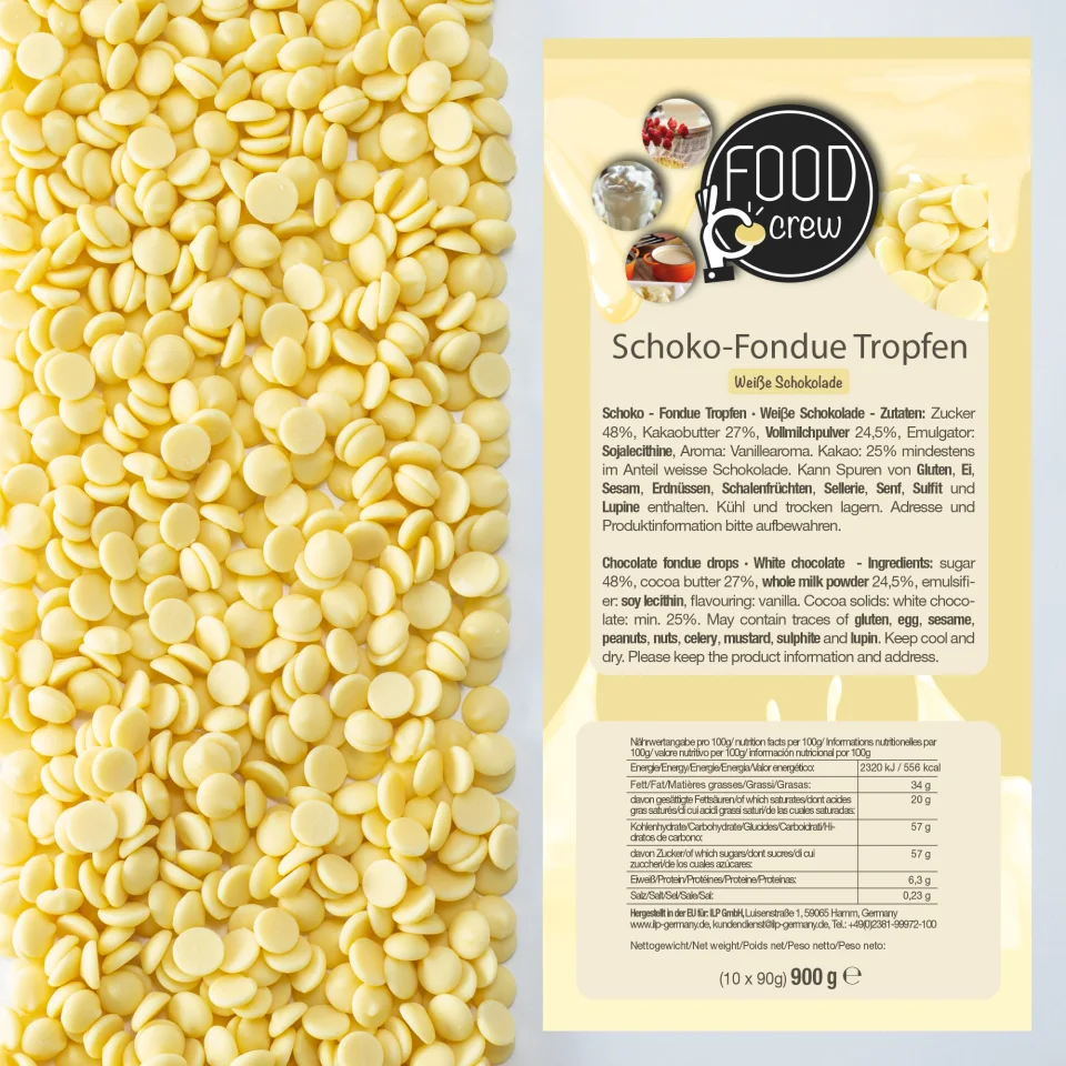 Mit den FOOD crew Schoko-Fondue Tropfen aus weißer belgischer Schokolade machst du jeden Anlass zu einem besonderen Highlight. Ob für romantische Abende, Silvesterfeiern oder Partys – die cremig-süße Schokolade ist ideal für Schokobrunnen, Fondue oder zum Backen und Dekorieren von Desserts.