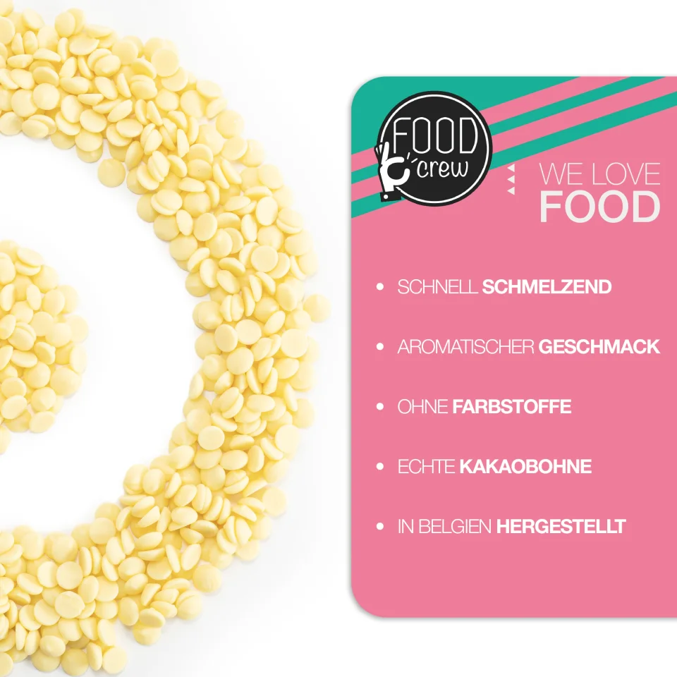 Die Schokodrops bestehen aus weißer belgischer Premium-Schokolade mit hohem Kakao- und Milchanteil und sind bekannt für ihre hervorragenden Schmelzeigenschaften. Perfekt, um Früchte, Kekse oder Marshmallows in zarte Schokolade zu tauchen oder zum Backen köstlicher Leckereien.