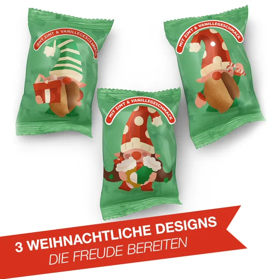 Unsere Weihnachts Wichtel Glückskekse sind das perfekte Geschenk für die Advents- und Weihnachtszeit. Jeder knusprige Glückskeks verbirgt eine kleine Botschaft, die Freude, Humor und Herzenswärme verbreitet – passend zur festlichen Jahreszeit. Verpackt in liebevoll gestalteten Folien mit drei süßen Wichtel-Motiven (Geschenk, Zuckerstange, Weihnachtssocke) sind die Kekse ein echter Hingucker und bringen sofort Weihnachtsstimmung.