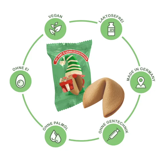 Die Weihnachts Wichtel Glückskekse sind vegan, laktosefrei, ohne Ei und palmölfrei. Hergestellt in Deutschland, verbinden sie Tradition mit moderner Festtagsfreude – und machen dein Geschenk zu etwas ganz Besonderem.