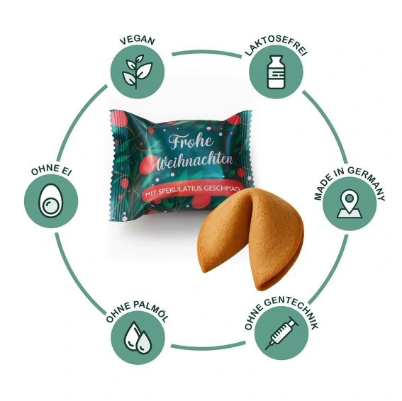 Hergestellt in Deutschland, aus rein pflanzlichen Zutaten: Unsere Glückskekse sind vegan und überzeugen mit winterlichem Aroma. Der feine Spekulatius-Geschmack passt perfekt zu Tee, Glühwein oder Kaffee und ist auch für bewusste Genießer eine ideale Wahl in der Adventszeit.